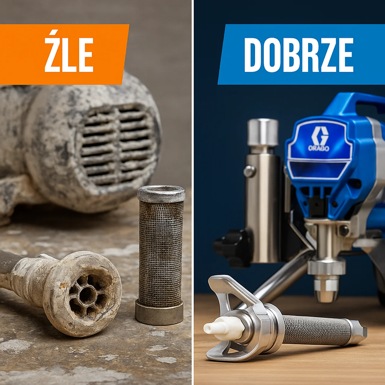 Najczęstszym błędem jest pozostawienie resztek materiału w układzie. Niewypłukana farba, masa czy gładź potrafi zaschnąć już po kilku godzinach, prowadząc do uszkodzenia zaworów, pompy czy pistoletu. To jedna z głównych przyczyn usterek zgłaszanych do serwisu.